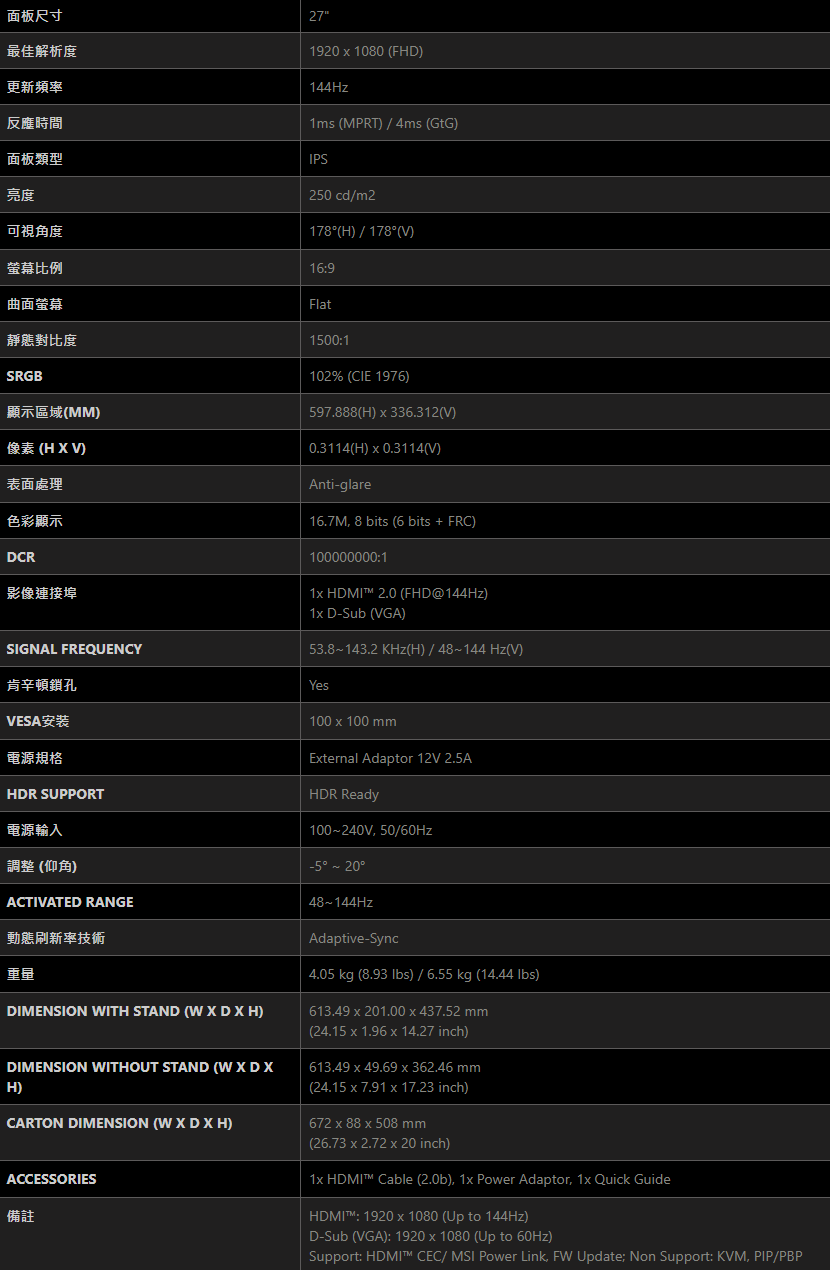 PRO MP273L E14 螢幕結合了 144Hz 更新率與 Adaptive-Sync 技術,帶來流暢的遊戲與工作體驗。符合人體工學的設計、IPS 面板以及 HDR Ready 功能,提升了舒適度與沉浸感,是兼顧多種需求的全方位顯示器。